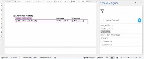 You will notice that the tag list now shows a list of the fields available for “Address History” (or whichever data group you selected). Now select the location, by clicking inside the cell, where you want one of these fields to be inserted and double click it in the tag list.
